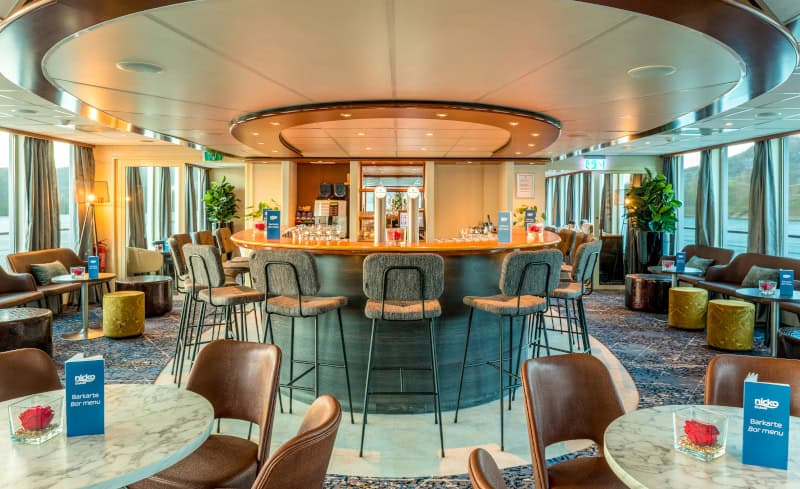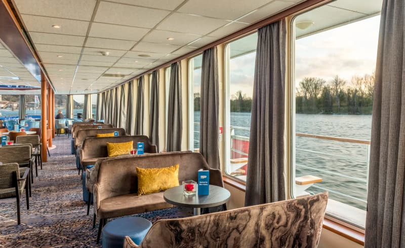Auf dem Oberdeck sind die elegant eingerichteten Deluxe-Kabinen mit absenkbaren Panoramafenstern ausgestattet, die über die gesamte Zimmerbreite und bis auf den Boden gehen. Voll abgesenkt kann man sich wie auf das Geländer eines Balkons stützen.