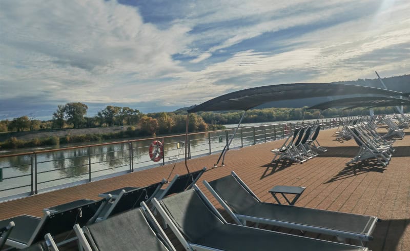Wir hatte zum Teil Sonnenschein auf der Fahrt mit der Bijou du Rhône und dies nutzten wir und die Gäste auf dem einladenden Sonnendeck. Wir ließen sich den Wind um die Nase wehen und entspannten beim sanften Dahingleiten des Flussschiffes an den vorbeiziehenden Landschaften.