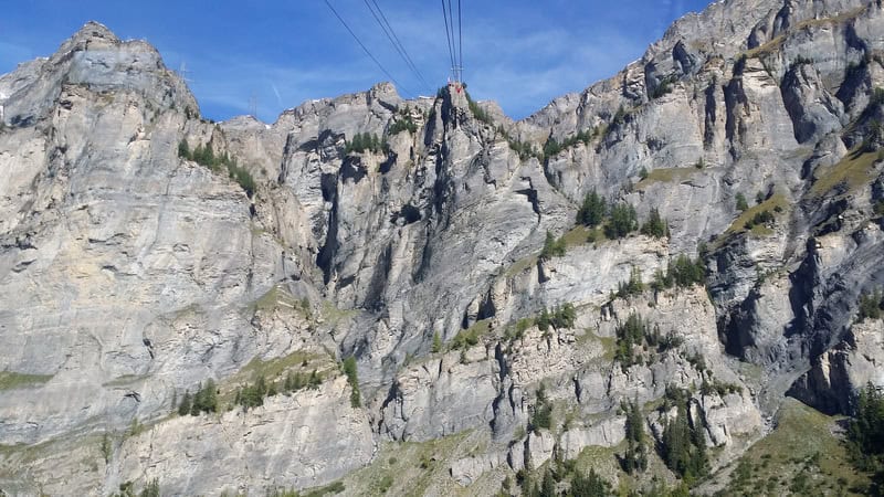 An der Felsenwand unterhalb der Bergstation der Gemmi ist ein Klettersteig angebracht und wie bestellt, klettert auch gerade ein besonders Mutiger in der Wand.