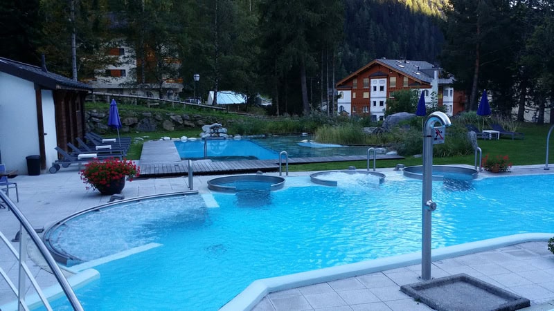 Auch das Vier Sterne Hotel Le Bristol, in dem ich bei meinem Aufenthalt in Leukerbad zu Gast war, verfügt über eine eigene Thermalquelle, die man im Spabereich nutzen kann. Im modernen, schönen Innenbecken und dem wunderschönen Außenbecken mit verschiedenen Sprudelanlagen kann man es sich so richtig gut gehen lassen. Hier genießen Sie beim Baden einen traumhaften Blick auf die Bergwelt.
